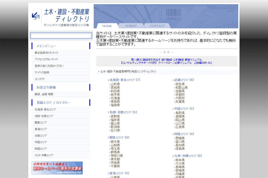 建築・土木・不動産業 専門の自動登録型のリンクディレクトリをつくりました。 土木・建設・不動産業ディレクトリ 建設・土木・不動産関係のホームページをお持ちでしたら、自由に登録できます。